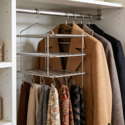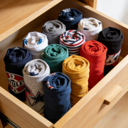 先筛选衣物,将换季和不常穿的衣物打包,只留当季常用款。折叠时用卷折法处理 T 恤、裤子、毛衣,卷成紧实圆柱状,竖放在抽屉或收纳盒里,既能避免褶皱,又能一目了然快速取用,比平铺节省 30% 空间。厚外套、衬衫等适合悬挂的衣物,换用植绒防滑衣架,比普通衣架更省横向空间,还能防止滑落;裤子用多层裤架悬挂,避免堆叠占用空间。