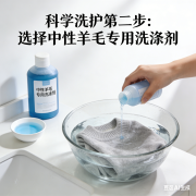 洗涤剂需选中性羊毛专用洗剂(pH 值 6-8),这类洗剂含温和表面活性剂,能温和去污且保护纤维鳞片,避免鳞片脱落缠绕导致缩水。严禁使用碱性强的洗衣粉、肥皂,也不能用含漂白成分的洗剂,会腐蚀羊毛纤维。