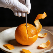 橙子洗净,用刀在蒂部切一个 1cm 深的小口,露出果肉