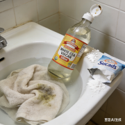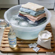 准备一盆温水,加入 2 勺白醋,放入毛巾浸泡 15 分钟,软化纤维中的污垢