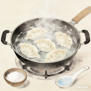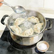 饺子粘皮是因饺子皮淀粉糊化,受热后粘连。盐水能提高水的沸点,让饺子皮受热均匀,同时增强淀粉稳定性;点冷水可降低水温,避免饺子皮煮烂,让馅料熟透。