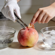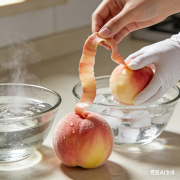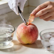 立即捞出桃子,放入冰水中浸泡 2 分钟,果皮会因冷却收缩,十字口处自动翘起
