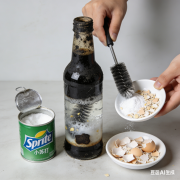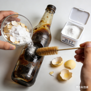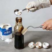 酱油瓶内壁的污垢是酱油残留的糖分、色素氧化形成,瓶身细长,手动刷洗难触及底部。鸡蛋壳碎片具有研磨性,能刮除内壁污垢;小苏打分解油脂和色素,二者搭配摇晃刷洗,无死角清洁。